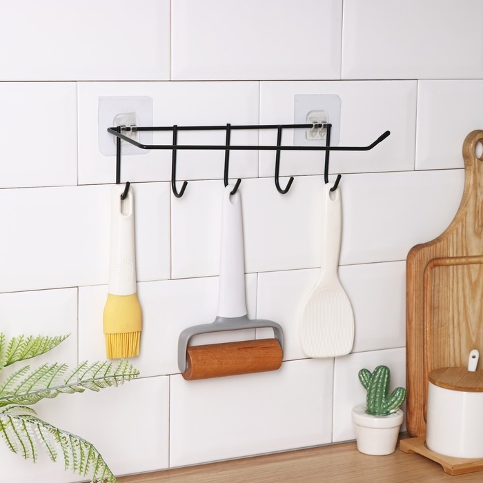 Держатель для кухонных принадлежностей настенный Доляна, 5 крючков, 28×8×8 см, цвет чёрный