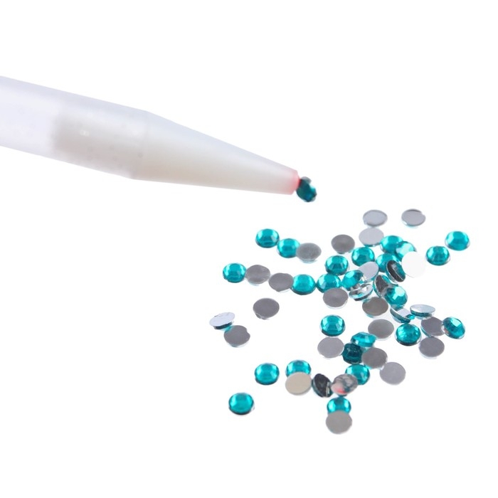 Снимите защитную плёнку с клеевой подушечки. Окуните в неё карандаш для алмазной вышивки таким образом, чтобы клей попал внутрь стержня. Он поможет вам с лёгкостью перенести стразы из поддона на картинку.