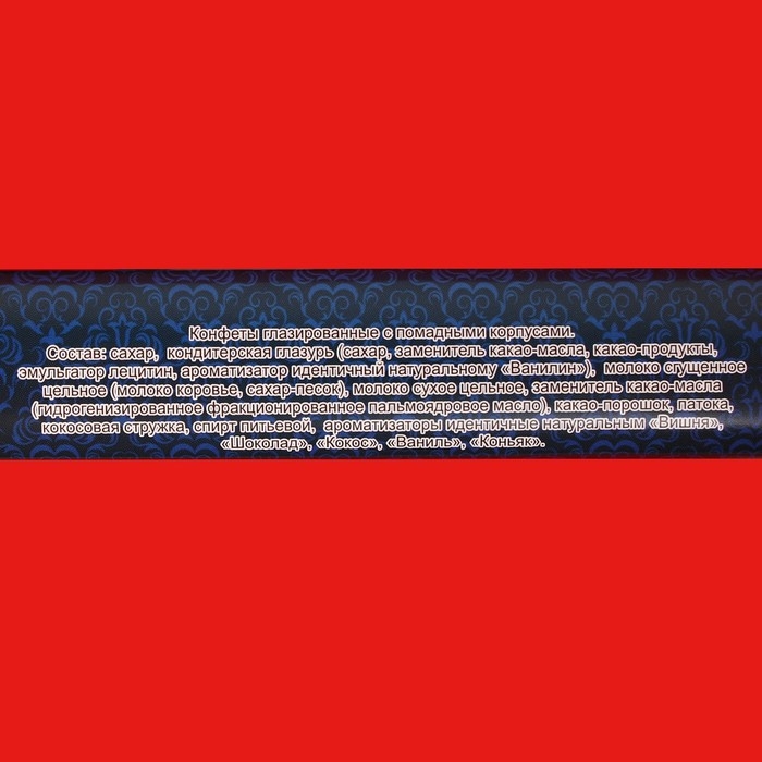 Состав: сахар, кондитерская глазурь (сахар, заменитель какао-масла, какао-продукты, эмульгатор лецитин, ароматизатор идентичный натуральному «Ванилин»), молоко сгущённое цельное (молоко коровье, сахар-песок), молоко сухое цельное, заменитель какао-масла (гидрогенизированное фракционированное пальмоядровое масло), какао-порошок, патока, кокосовая стружка, спирт питьевой, ароматизаторы идентичные натуральным «вишня», «шоколад», «кокос», «ваниль», «коньяк».