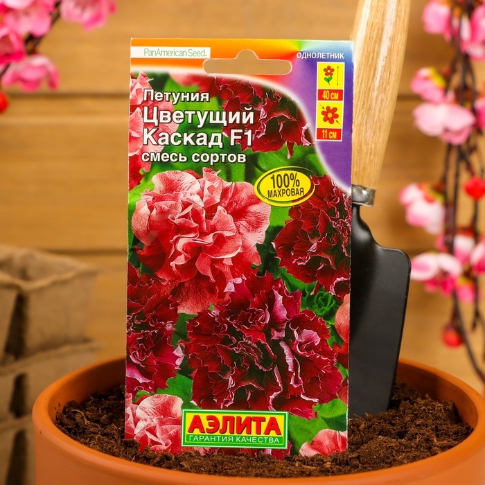 100% махровая. Подлинный шедевр среди петуний – «Цветущий каскад» – гибрид с великолепными поникающими побегами до 40 см в длину и крупными, густомахровыми цветами Ø11-13 см. На протяжении всего сезона, с весны до поздней осени, образует каскады подёрнутых розовым и вишнёвым туманом соцветий, очень устойчивых к неблагоприятным условиям и долго сохраняющих свою декоративность.