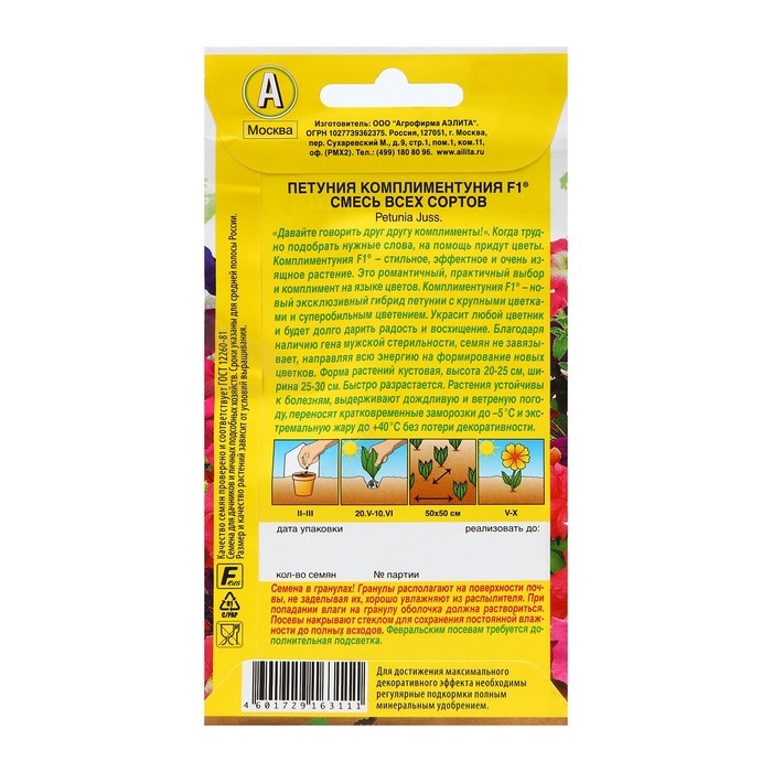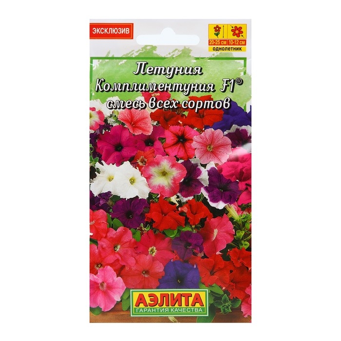 «Давайте говорить друг другу комплименты». Когда трудно подобрать нужные слова, на помощь придут цветы. Комплиментуния F1® – стильное, эффектное и очень изящное растение. Это романтичный, практичный выбор и комплимент на языке цветов. Комплиментуния F1® – эксклюзивный гибрид (новая петуния) с крупными цветками и суперобильным цветением. Украсит любой цветник и будет долго дарить радость и восхищение. Благодаря наличию гена мужской стерильности семян не завязывает, направляя всю энергию на формирование новых цветков. Форма растений кустовая, со склонностью к трейлингу: ширина больше высоты. Высота 20-25 см, ширина 25-30 см. Быстро разрастается. Растения устойчивы к болезням, выдерживают дождливую и ветреную погоду, переносят кратковременные заморозки до –5°С и экстремальную жару до +40°С без потери декоративности.
