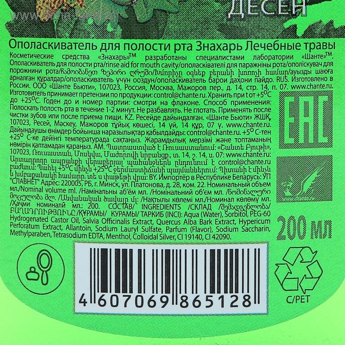 Ополаскиватель «Знахарь» с экстрактами зверобоя, шалфея, коры дуба и серебром эффективно подавляет рост патогенной микрофлоры и задерживает развитие патологического процесса, ускоряет трофику дёсен и слизистой полости рта.