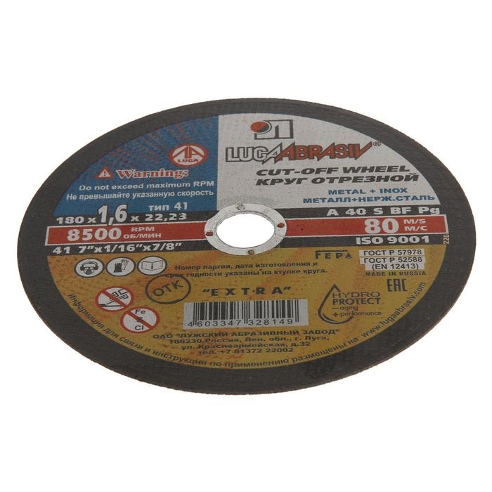 Круг отрезной по металлу + нерж. стали "Луга", A 40 S BF 80 (14А БУ), 180х1.6х22 мм