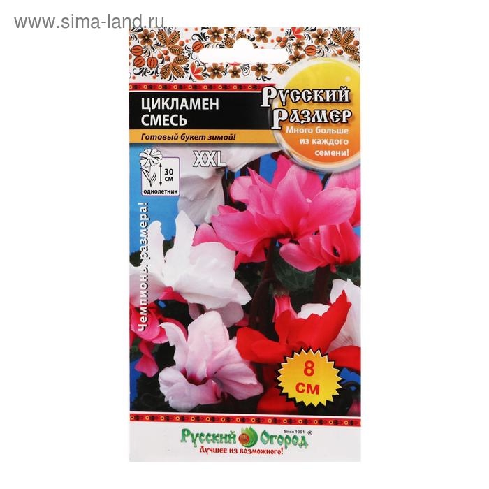 Цикламен Русский Размер – относится к необычным сортам Цикламенов (семейство Мирсиновые или Первоцветные). Он отличается от всех остальных великолепными и необычайно крупными цветками, расположенными на длинных цветоносах. Средний диаметр варьируется от 8 до 10 сантиметров, а количество лепестков от 7 до 11 штук.