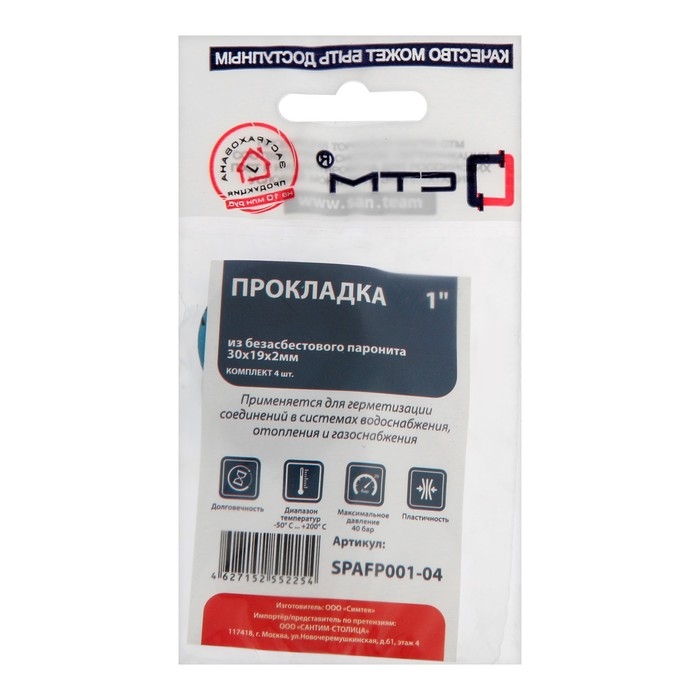 Набор прокладок "СТМ" SPAFP001-04, 1", 30х19 мм, h=2 мм, безасбестовый паронит, 4 шт.