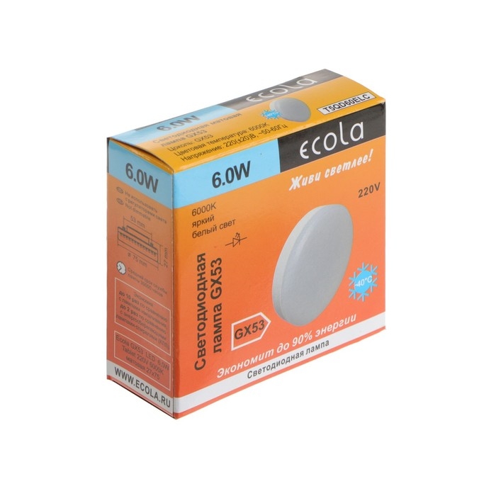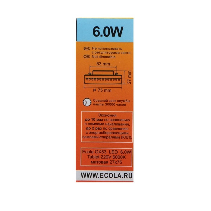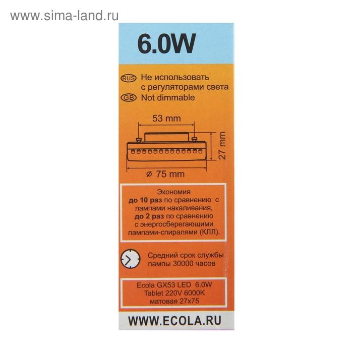 Лампа светодиодная Ecola Tablet, GX53, 6 Вт, 6000 К, 220 В, 27x75 мм, матовое стекло