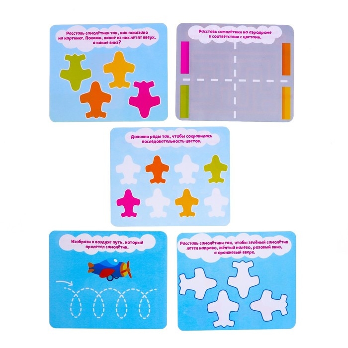 В наборе малыш обнаружит 4 фигурки самолётов и 10 двусторонних карточек с заданиями.