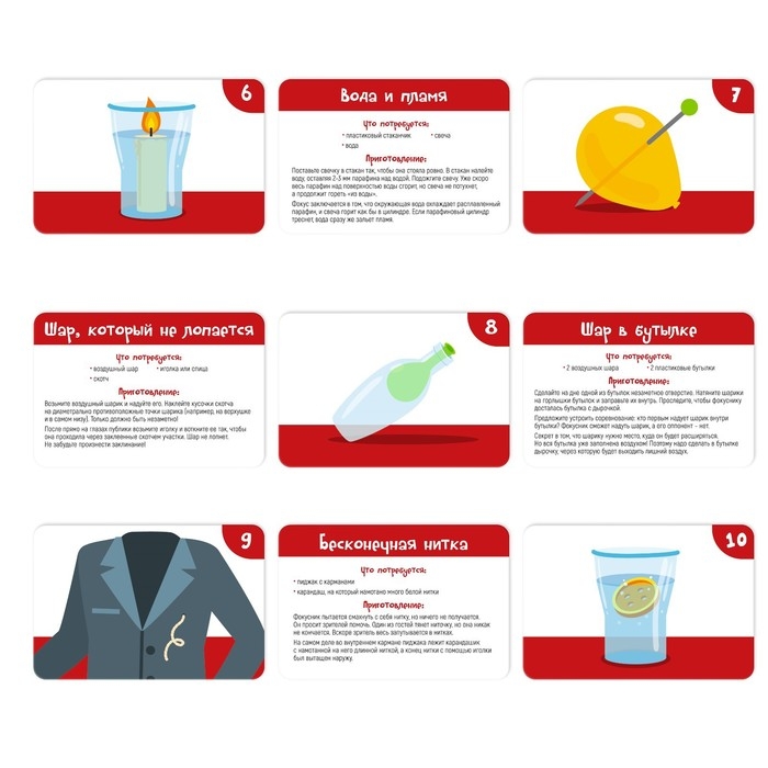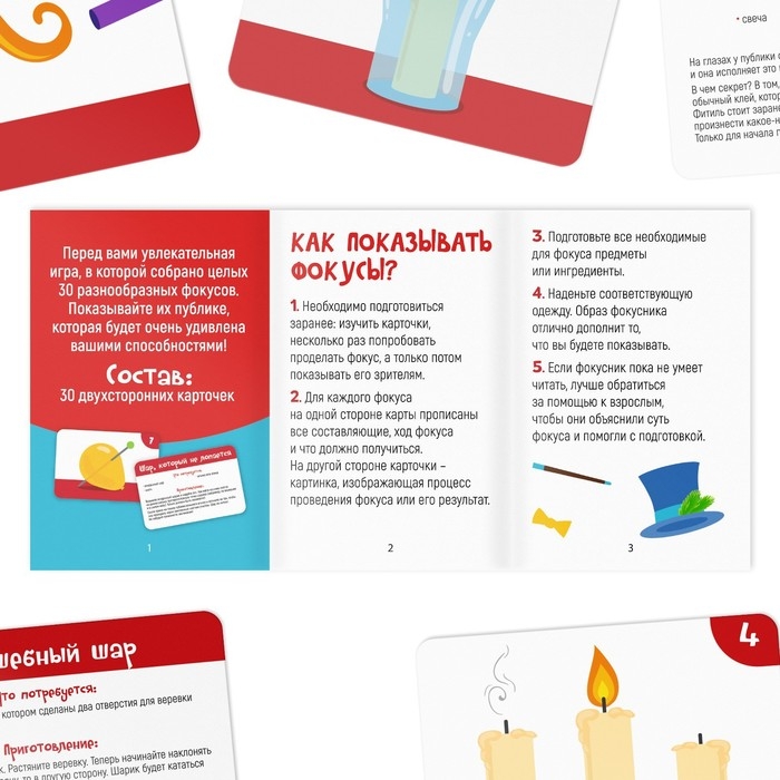 Необходимо подготовиться заранее: изучить карточки, несколько раз попробовать проделать фокус, а только потом показывать его зрителям. Для каждого фокуса на одной стороне карты прописаны все составляющие, ход фокуса и что должно получиться. На другой стороне карточки — картинка, изображающая процесс проведения фокуса или его результат.
