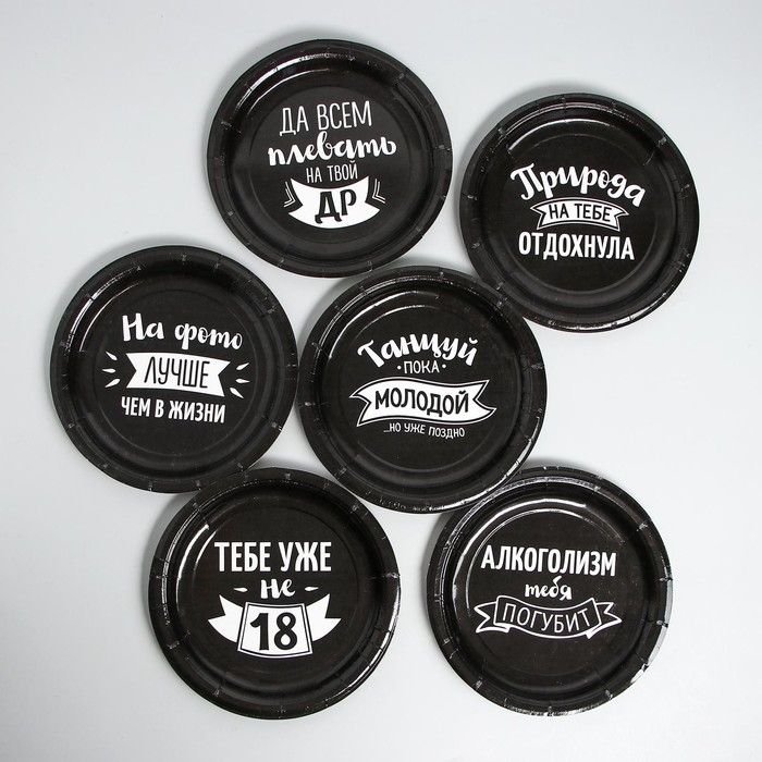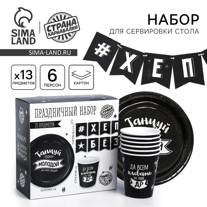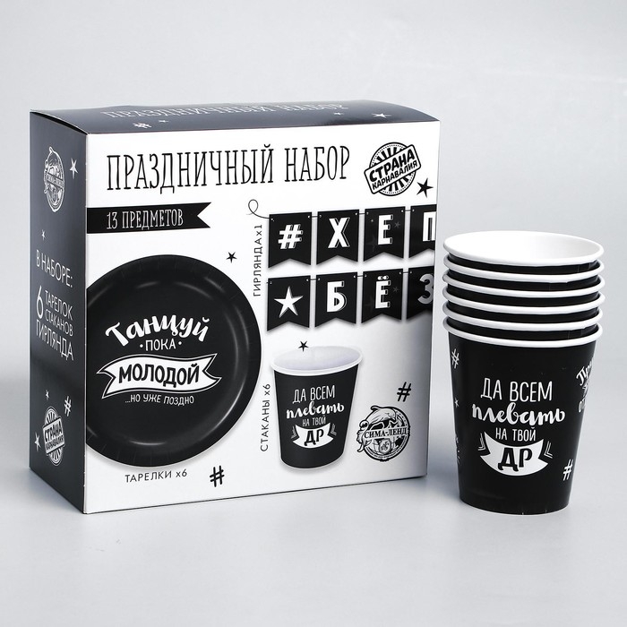 Набор бумажной посуды одноразовый Happy Birthday, 6 тарелок , 1 гирлянда , 6 стаканов, 6 колпаков