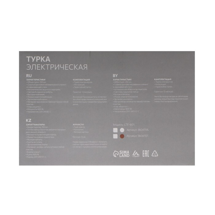 Турка электрическая Luazon LTE-601, 600 Вт, 250 мл, защита от включения без воды, коричневая