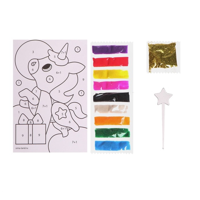 Процесс создания картины из песка прост и увлекателен. Снимите верхний слой с одного сектора картинки и засыпьте его песком или блёстками, помогайте стекой. Можете ориентироваться на цифры в секторах и подсказку на упаковке или пофантазировать и создать свою уникальную картину! Трогательные пожелания в открытке сделают подарок ещё приятнее.