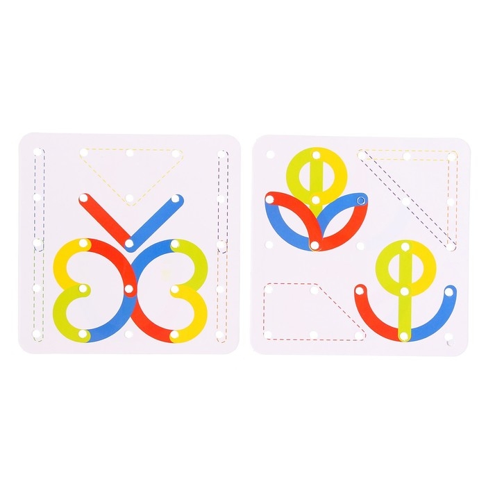 Геоборд — красочная игровая основа с тематическим орнаментом, на которой расположены штырьки. В комплекте есть набор деталей для конструирования, резиночки, карточки и схемы сборки.