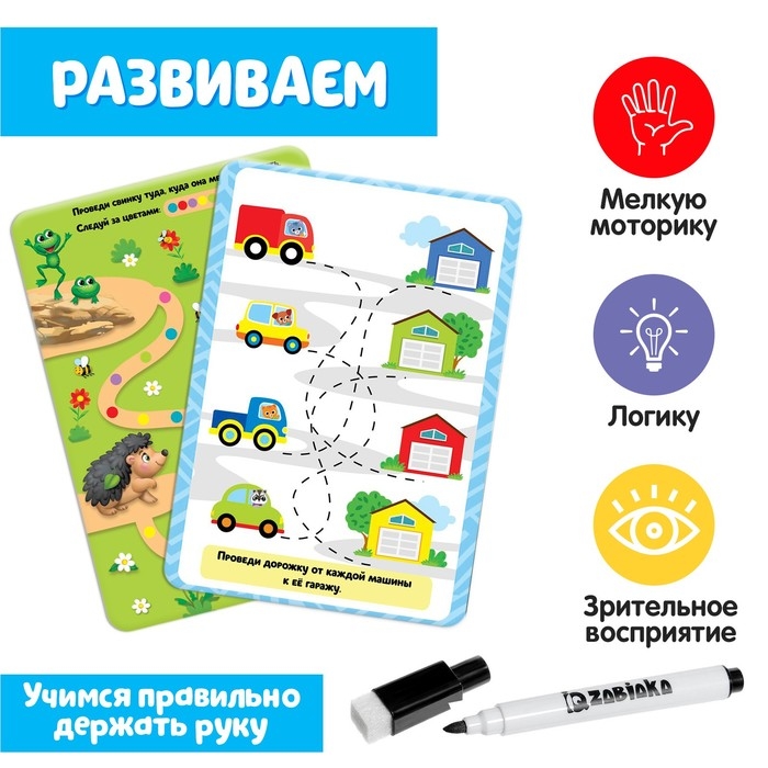 - В комплекте малыш найдёт маркер и 20 заданий.