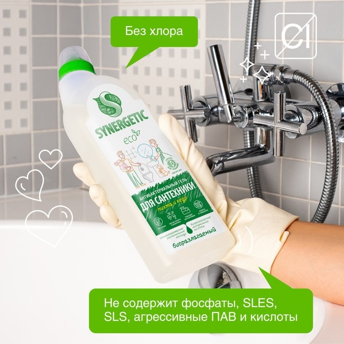 Биоразлагаемое антибактериальное средство для сантехники SYNERGETIC "Пихта и кедр" - концентрированное чистящее средство для ежедневной уборки поверхностей, устойчивых к кислотным моющим средствам, в ванных комнатах и санузлах: унитаза, раковины, ванны, душевой кабины, керамической плитки, акриловых, фаянсовых и эмалированных поверхностей.