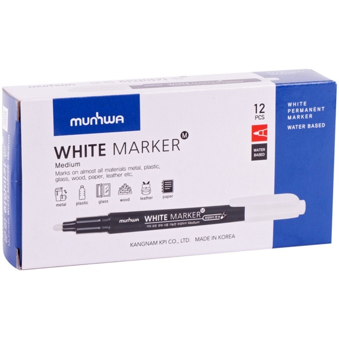Перманентный маркер MunHwa предназначен для маркировки большинства поверхностей: резина, дерево, металл, пластик, ПВХ, плитка, стекло, керамика, картон, кожа. Круглый пишущий узел из акрила диаметром 4 мм создает линии толщиной 2,5 мм. Яркий и насыщенный цвет чернил. Чернила на водной основе. Цвет чернил белый. Упаковка: картонная коробка по 12 штук.