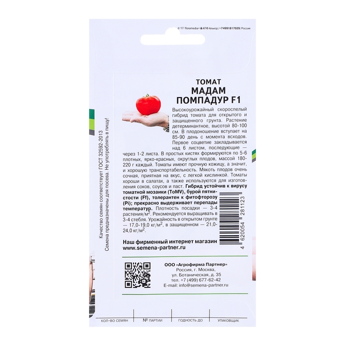 Очень урожайный скороспелый гибрид томата для открытого и защищенного грунта. Растение детерминантное, высотой 80-100 см. В плодоношение вступает на 85-90 день с момента всходов. Первое соцветие закладывается над 6 листом, последующие через 1-2 листа. В простых кистях формируются 5-6 плотных, ярко-красных, округлых плодов, массой 180-220 г каждый. Томаты имеют прочную кожицу, что сказывается на хорошей транспортабельности. Мякоть плодов очень сочная, приятная на вкус, с легкой кислинкой. Томаты хороши в свежих салатах, а также используются для изготовления соков, соусов и паст. Гибрид устойчив к вирусу томатной мозаики, бурой пятнистости, толерантен к фитофторозу; прекрасно выдерживает перепады температур. Плотность посадки 3-4 растения/м². Рекомендуем выращивать в 3-4 стебля.
