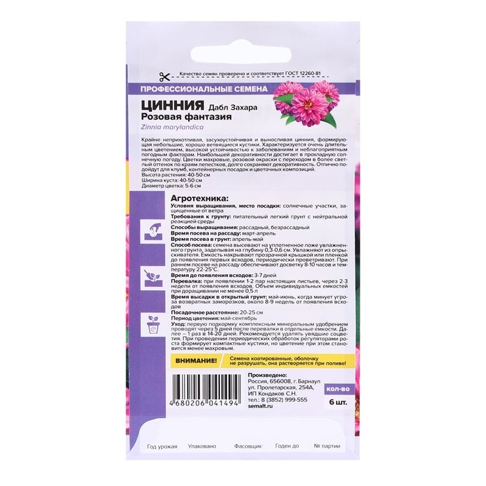 Семена цветов Цинния Дабл Захара "Розовая фантазия", 5 шт