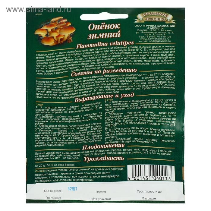 Традиционный в России съедобный гриб, всегда ценился за обильный урожай, сильный аромат и нежную мякоть. Опенок зимний, в природных условиях, растет при температурах ниже 15 С. Его собирают даже под снегом. Шляпка диаметром 2—10 см, плоская (у молодых грибов выпуклая), желтая, медово-коричневая или оранжево-коричневая. Мякоть тонкая, от белой до светло-жёлтой, с приятным вкусом. Ножка трубчатая, плотная, характерного бархатисто-коричневого цвета, наверху красновато-коричневая. Перед употреблением опята рекомендуется отварить и отвар слить. Далее грибы можно жарить, солить, мариновать, добавлять в супы. Сушеные грибы отваривать не обязательно. Опёнок зимний легко культивировать, и результат виден очень быстро. Поэтому он – идеальный вариант для новичков. Советы по разведению: Выращивают как на открытом воздухе, так и в закрытых помещениях при температуре от 10 до 27°С. Благоприятное время для высадки грибов на древесную основу в природных условиях — с апреля по сентябрь, в помещении — в течение всего года. В качестве древесной основы используют несвежее (1 месяц после срубки), влажное (влажность минимум 50-60 %) бревно лиственных пород (ясень, тополь, ива, ольха, береза, липа, грецкий орех, каштан и бук) без признаков гнили, с корой и без веток, диаметром 15-50 см, длиной 30-50 см. Если древесина сухая ее замачивают в воде на 2-3 дня, избытку воды дают стечь. Пропитанную древесину помещают в теплое, проветриваемое помещение на несколько дней. Выращивание и уход: I этап - 1. В подготовленном бревне просверливают отверстия диаметром 0,8 см и длиной 4 см в шахматном порядке на расстоянии около 10 см друг от друга. 2. Вставляют грибные палочки в отверстия до упора (операцию проделывают в стерильных перчатках или продезинфецированными спиртом руками). 3. Оборачивают бревно полиэтиленовой пленкой, сделав небольшие отверстия для доступа воздуха. 4. Помещают бревно в темное влажное помещение и оставляют обрастать мицелием. При температуре 20 С бревно обрастает 2-3 месяца, при температуре 10 С – 3-4 месяца. При температуре выше 33 ?С мицелий может погибнуть. Бревна заросли если на поверхности, в местах заражения, виден белый мицелий. II этап - 1. В затененном и защищенном от ветра месте в саду выкапывают лунку глубиной 10-15 см, дно лунки увлажняют. Можно выращивать на балконе, посадив древесину после оброста мицелием в кадку с землей. 2. Обросшее грибницей бревно закапывают вертикально одним концом на глубину до 1/3-1/2 длины. Обсыпают почву вокруг бревна древесной золой (для борьбы с улитками). Оптимальная температура для образования плодовых тел – от 8 до 12°С. 3. В сухую погоду почву вокруг бревна поливают каждую неделю из расчета 5л на 1м?. Поздней осенью бревно присыпают листьями и оставляют зимовать. 4. Со следующей весны закладку регулярно увлажняют по мере необходимости. Плодоношение: Первый урожай при выращивании на мягкой древесине (береза, тополь, ива, липа) через 5 месяцев, на твердой (бук, дуб, ясень, клен) – через 9 месяцев. Плодоношение волнами до 3-4 лет на мягкой древесине, 5-7 лет на твердой. Урожайность: От 20 до 50% от веса бревна. Состав: Мицелий грибов "Опенок зимний" на древесных палочках. Невскрытый пакет хранить в сухом прохладном месте, возможно в холодильнике при положительной температуре.