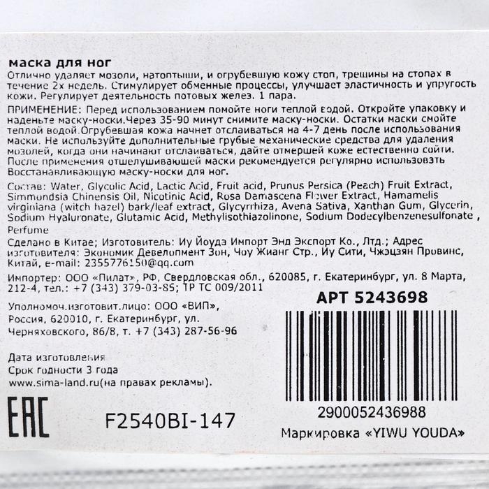 Отшелушивающая маска-носки для ног на основе персика, размер универсальный, 1 пара