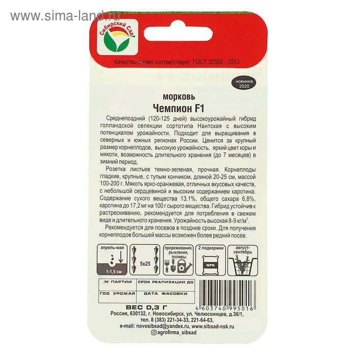 Новый высокоурожайный гибрид нантского типа голландской селекции. Период созревания 135 дней. Корнеплоды гладкие: крупные, длиной 20-25 см с тупым кончиком, устойчивы к растрескиванию, с небольшой сердцевиной и высоким содержанием каротина. Масса корнеплода 200-250 гр. Подходит как для потребления в свежем виде, так и для длительного хранения.