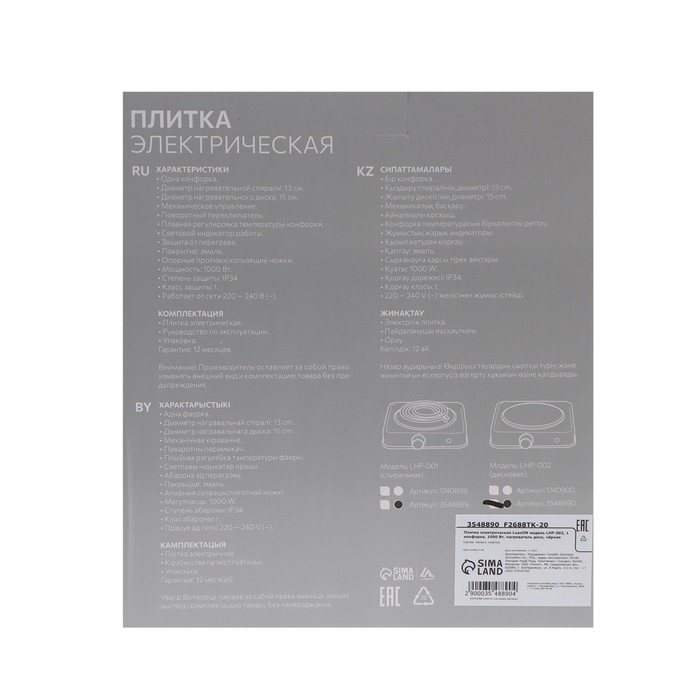Плитка электрическая Luazon LHP-001, 1 конфорка, 1000 Вт, нагреватель спираль, черная