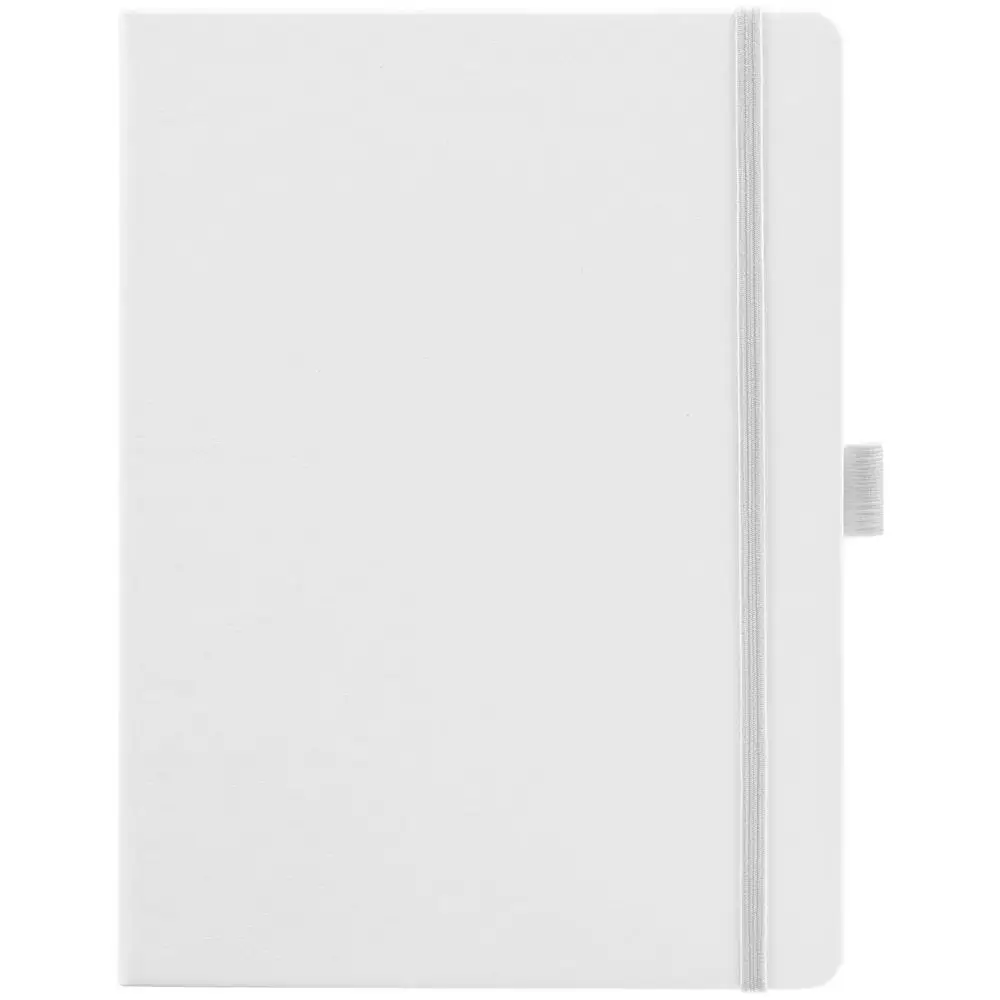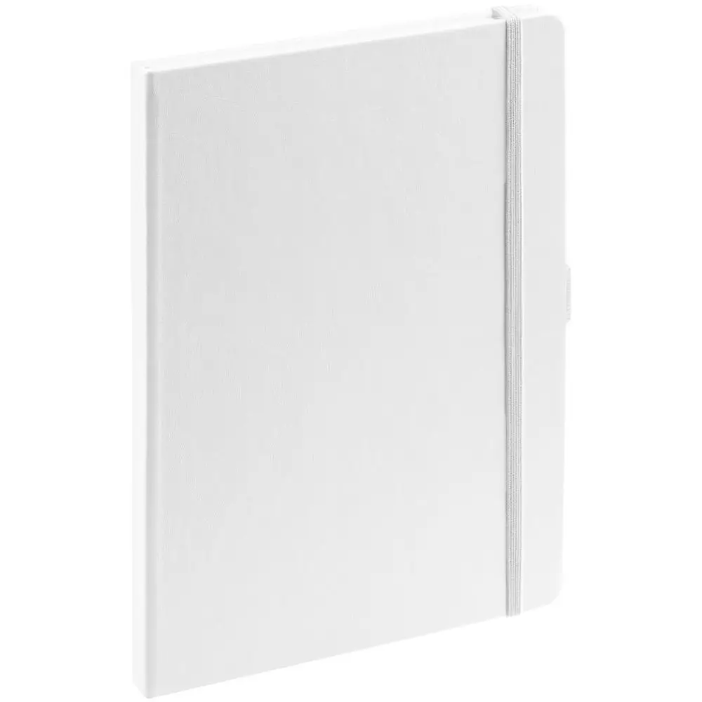 Еженедельник в твердой обложке выполнен из материала Nebraska, белый ВВ, дополнен резинкой, петлей для ручки и ляссе белого цвета.