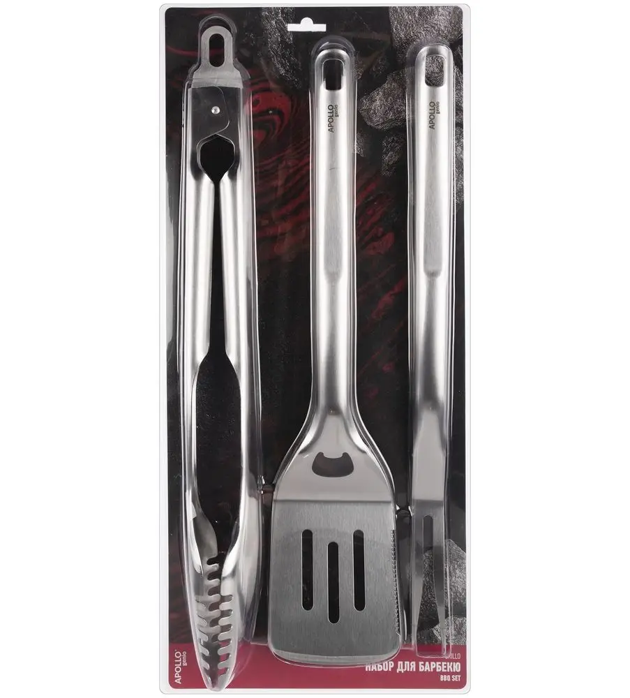 В набор входят: щипцы, вилка и лопатка.