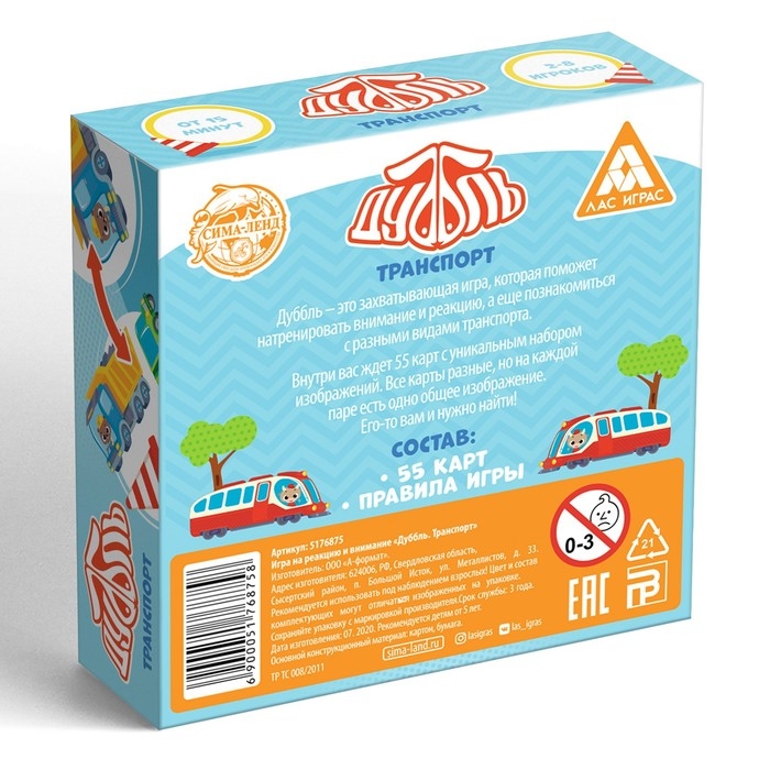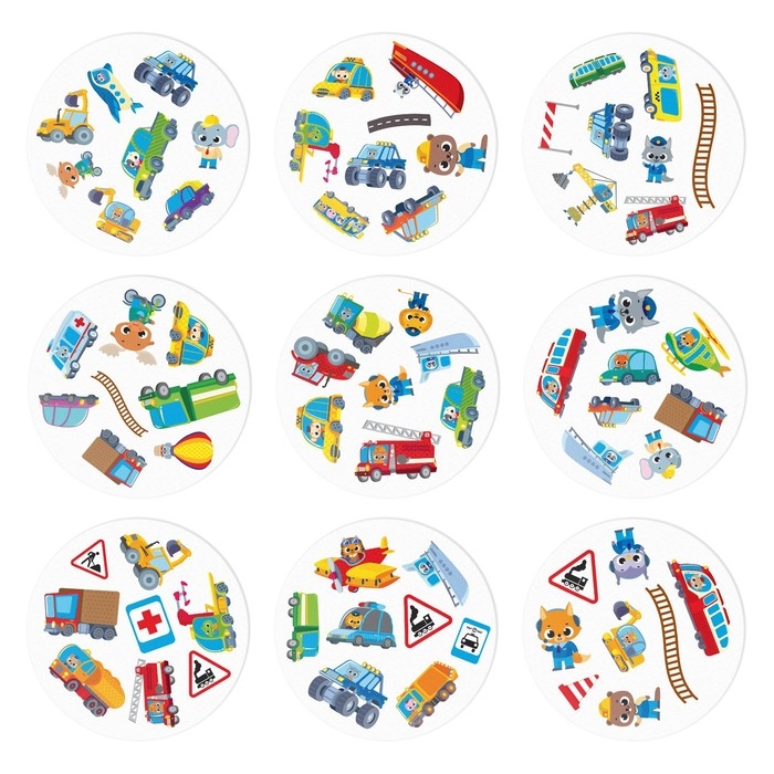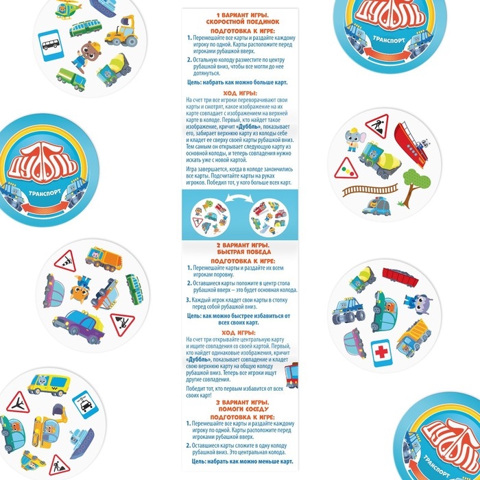 «Дуббль» — это захватывающая игра, которая поможет натренировать внимание и реакцию, а ещё познакомиться с разными видами транспорта. Внутри вас ждёт 55 карт с уникальным набором картинок. Все карты разные, но на каждой паре есть одно общее изображение. Его-то вам и нужно найти!