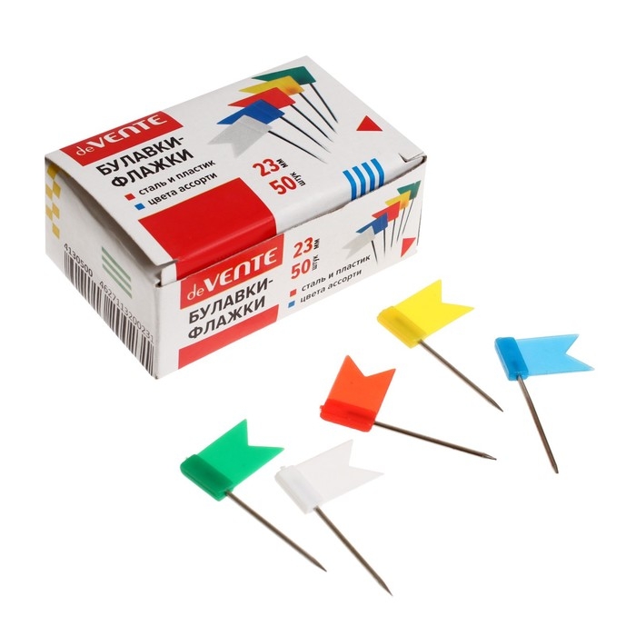 Булавки офисные deVENTE с пластиковым флажком 23 мм, 50 шт в картонной коробке, ассорти