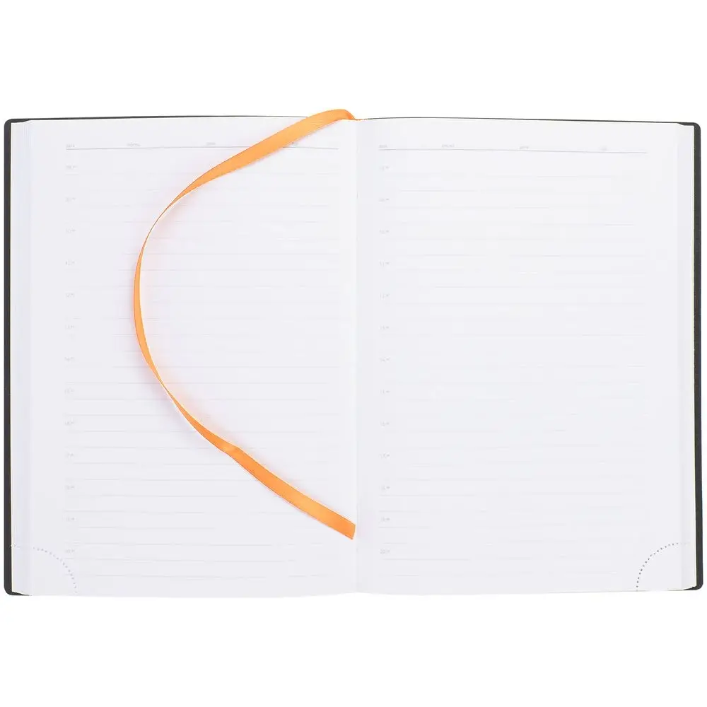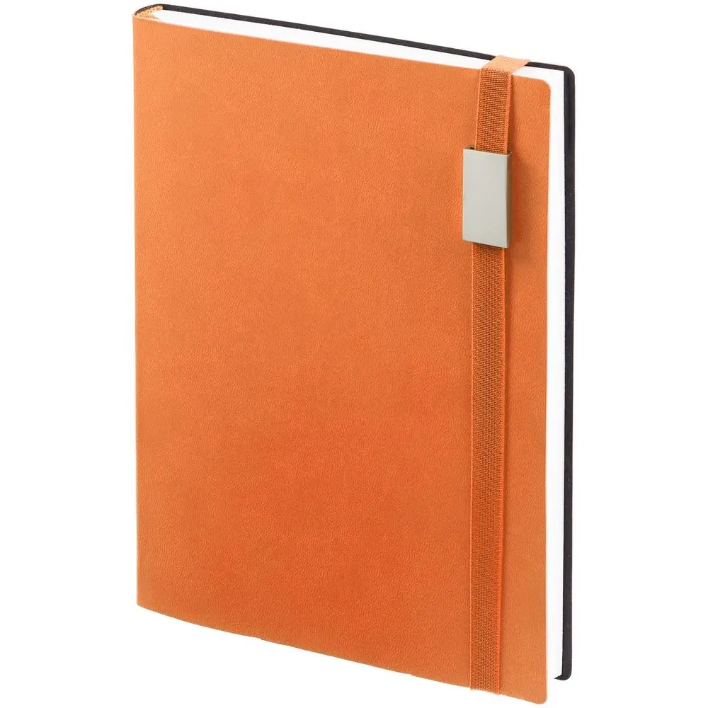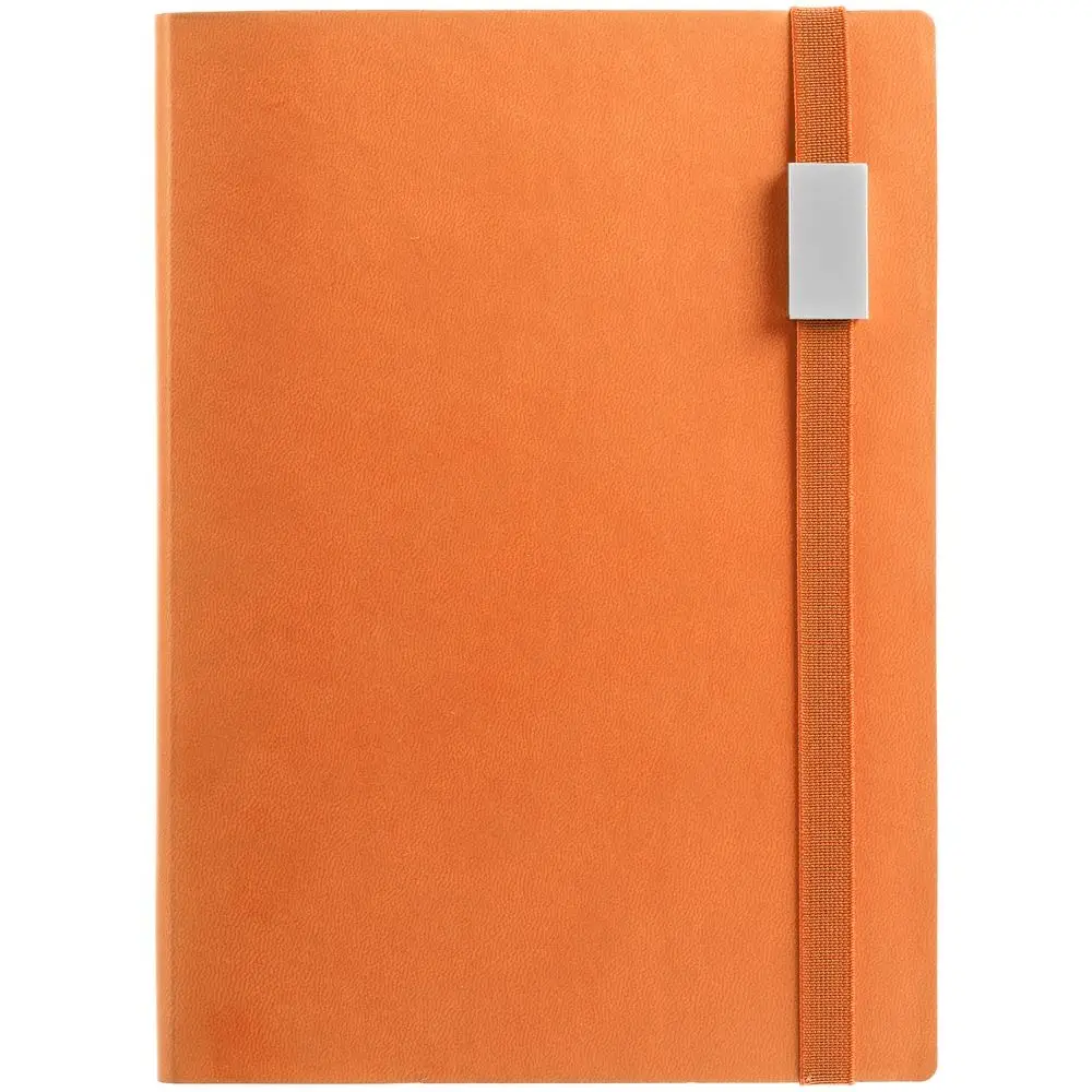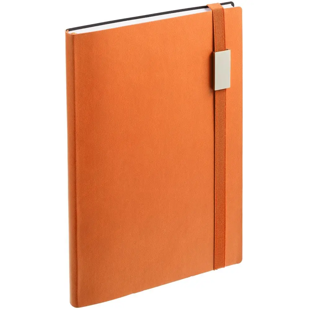 Ежедневник с гибкой обложкой, выполнен из материала Latte, оранжевый OO, дополнен резинкой шириной 1 см с металлическим шильдом, капталом и ляссе оранжевого цвета.