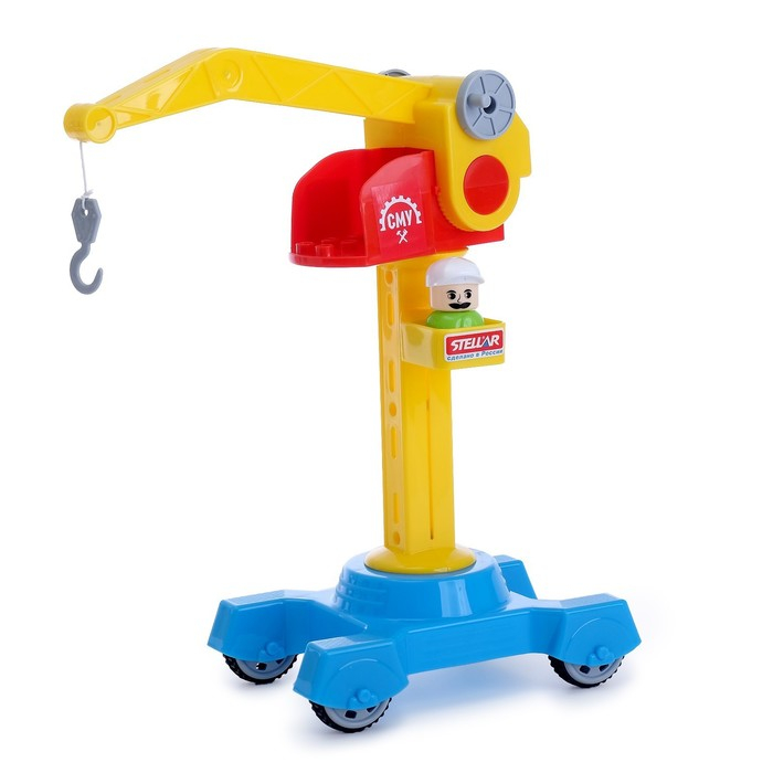 Ребёнок сможет ловко сматывать верёвку-трос с крюком, на котором закрепляется груз, при помощи лебёдки с двумя ручками. Игрушка имеет надёжную устойчивую платформу, оборудованную четырьмя колёсиками, благодаря чему башенный кран легко перемещается в любую точку детской строительной площадки.
