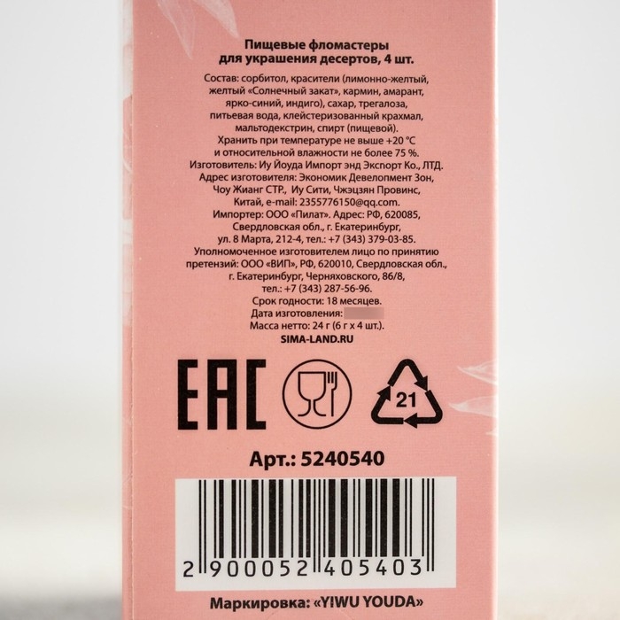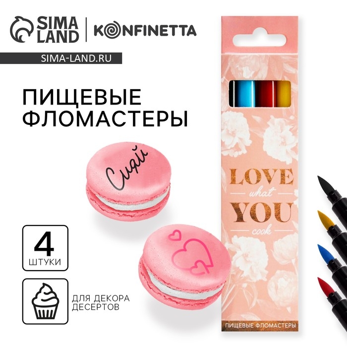 Фломастеры пищевые для украшения десертов, набор: красный, голубой, жёлтый, чёрный, 4 шт.
