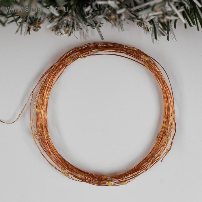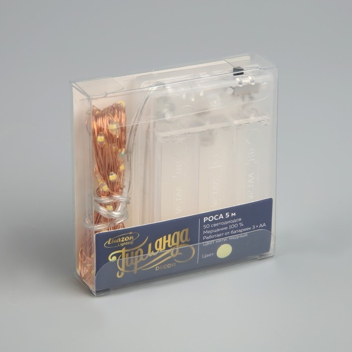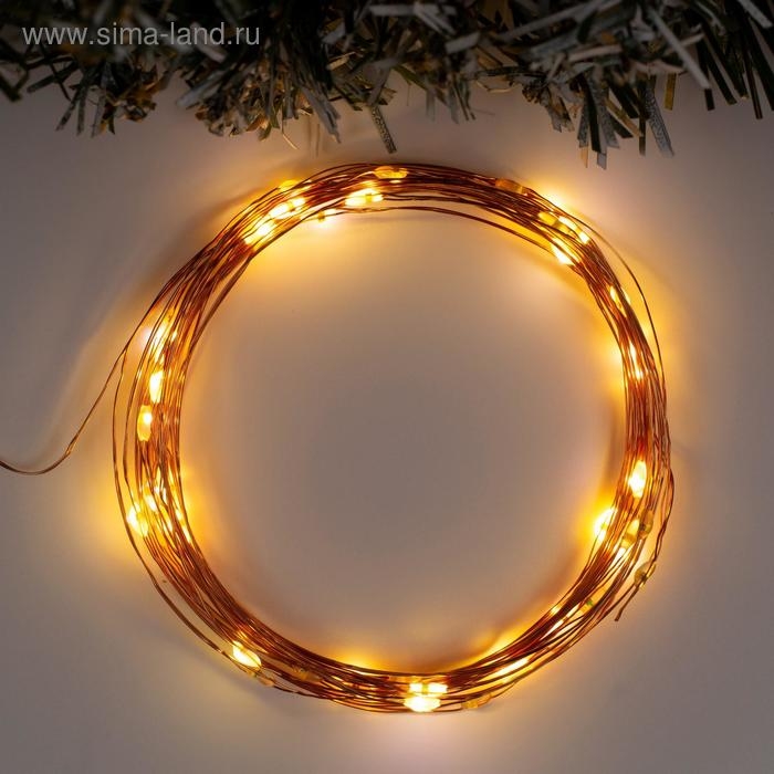 Гирлянда «Нить» 5 м роса, IP20, медная нить, 50 LED, мерцание всех светодиодов, батарейки AAх3 (нет в комплекте), свечение тёплое белое