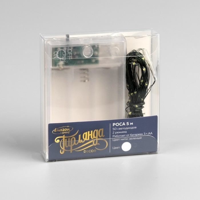 Гирлянда «Нить» 5 м роса, IP20, зелёная нить, 50 LED, 2 режима, батарейки AAх3 (нет в комплекте), свечение белое