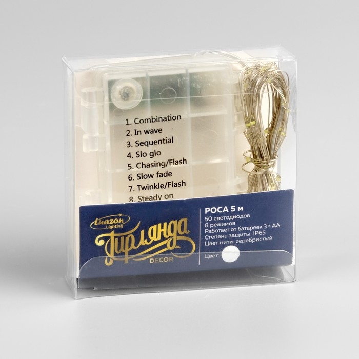 Гирлянда «Нить» 5 м роса, IP65, серебристая нить, 50 LED, 8 режимов, батарейки AAх3 (нет в комплекте), свечение белое