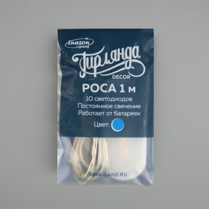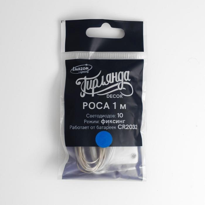 Гирлянда «Нить» 1 м роса, IP20, серебристая нить, 10 LED, батарейки CR2032х2 (в комплекте), свечение синее