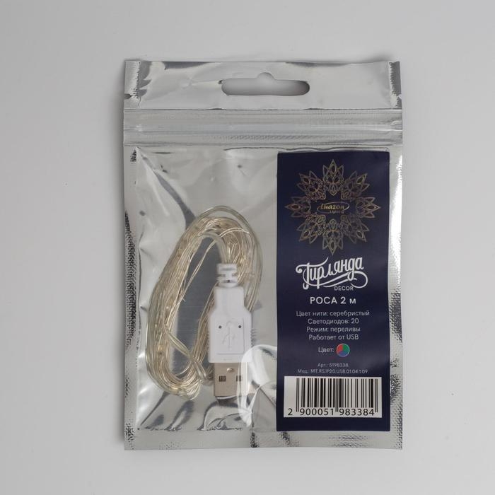 Гирлянда «Нить» 2 м роса, IP20, серебристая нить, 20 LED, свечение мульти (RGB), переливы, USB