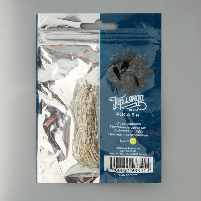 Гирлянда «Нить» 5 м роса, IP20, серебристая нить, 50 LED, свечение тёплое белое, USB