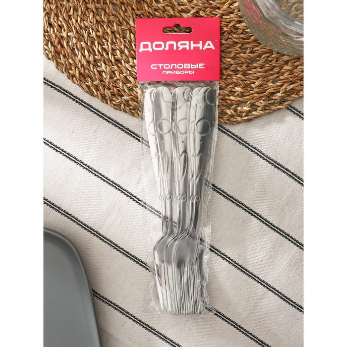 Набор столовых вилок Доляна «Бабл» имеет классический силуэт и четкие контуры. Гладкие отполированные до зеркального блеска ручки приятно держать в руке. Каждый предмет имеет средний вес и размер, на ручках интересный дизайн. Зубья вилок достаточно длинные, чтобы выглядеть элегантно, но при этом они удобны для использования.