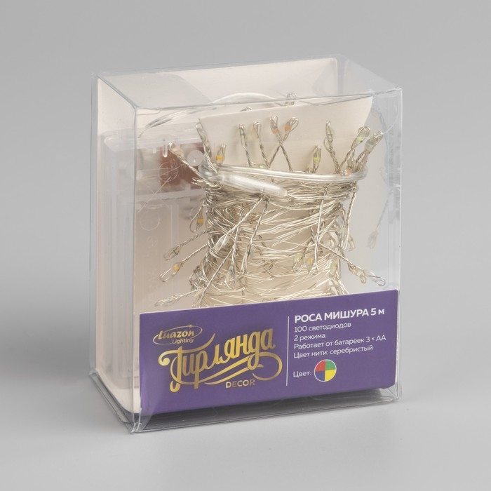 Гирлянда «Мишура» 5 м роса, IP20, серебристая нить, 100 LED, 2 режима, батарейки AAх3 (нет в комплекте), свечение мульти