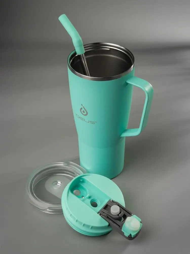 - 2 крышки в комплекте: одна на 100% герметичная с механизмом блокировки отверстия для питья, вторая — с отверстием для трубочки