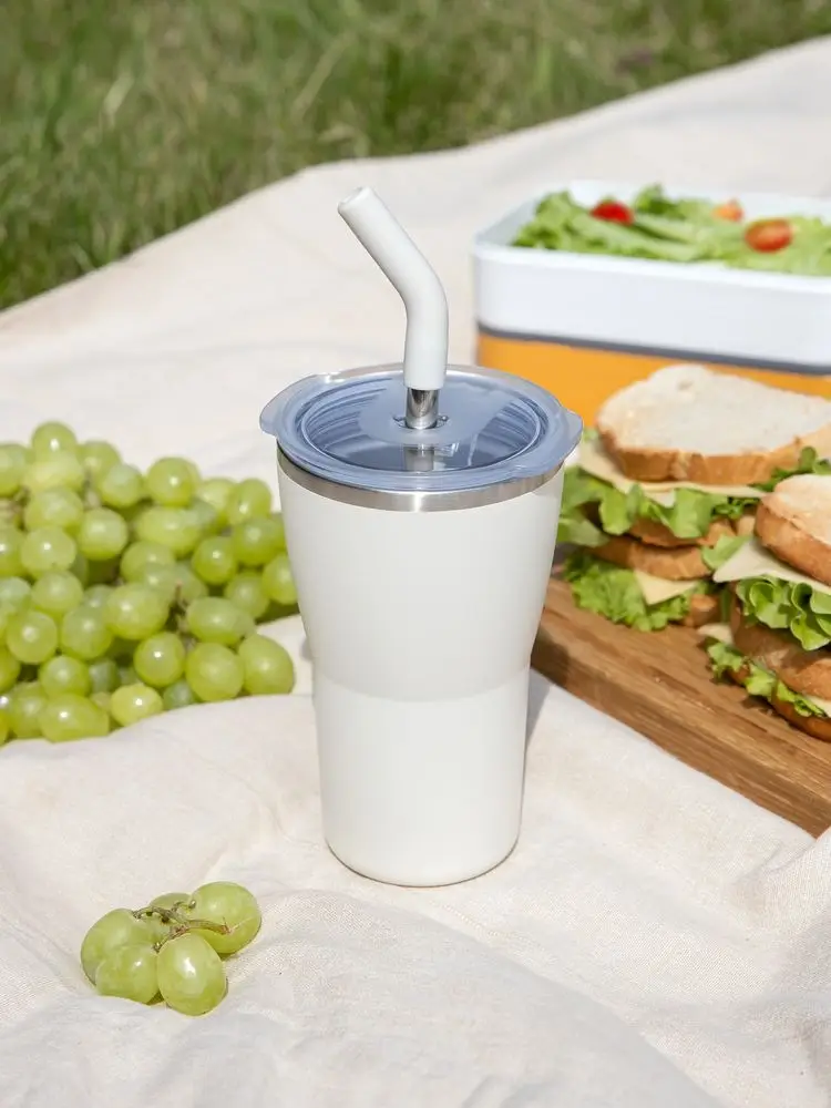 - 2 крышки в комплекте: одна на 100% герметичная с механизмом блокировки отверстия для питья, вторая — с отверстием для трубочки