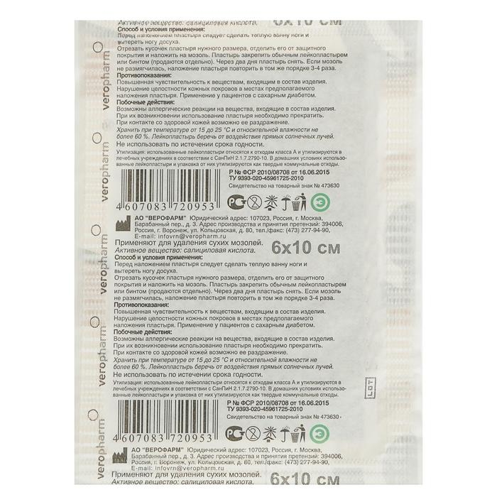 Способ применения: перед наложением мозольного лейкопластыря следует сделать теплую ванну ноги и вытереть ногу досуха. Мозольный лейкопластырь на фиксирующем лейкопластыре: С полоски лейкопластыря снять защитное покрытие. Мозольный лейкопластырь (темный цвет полоски) наложить на мозоль, а липкую часть (белый цвет полоски) приклеить к коже, слегка прижав пальцами. Через два дня лейкопластырь снять. Если мозоль не размягчилась, наложение мозольного лейкопластыря повторить в том же порядке 3-4 раза. Мозольный лейкопластырь в комплекте с фиксирующем лейкопластырем: Отрезать пластырь (темного цвета) нужного размера, отделить его от защитного покрытия, наложить на мозоль и закрыть полоской фиксирующего лейкопластыря (белого цвета), шириной несколько большей, чем наложенный пластырь. Через два дня лейкопластырь снять. Если мозоль не размягчилась, наложение мозольного лейкопластыря повторить в том же порядке 3-4 раза. Мозольный лейкопластырь: Отрезать кусочек пластыря нужного размера, отделить его от защитного покрытия, наложить на мозоль. Пластырь закрепить обычным лейкопластырем или бинтом (продается отдельно). Через два дня пластырь снять. Если мозоль не размягчилась, наложение пластыря повторить в том же порядке 3-4 раза.