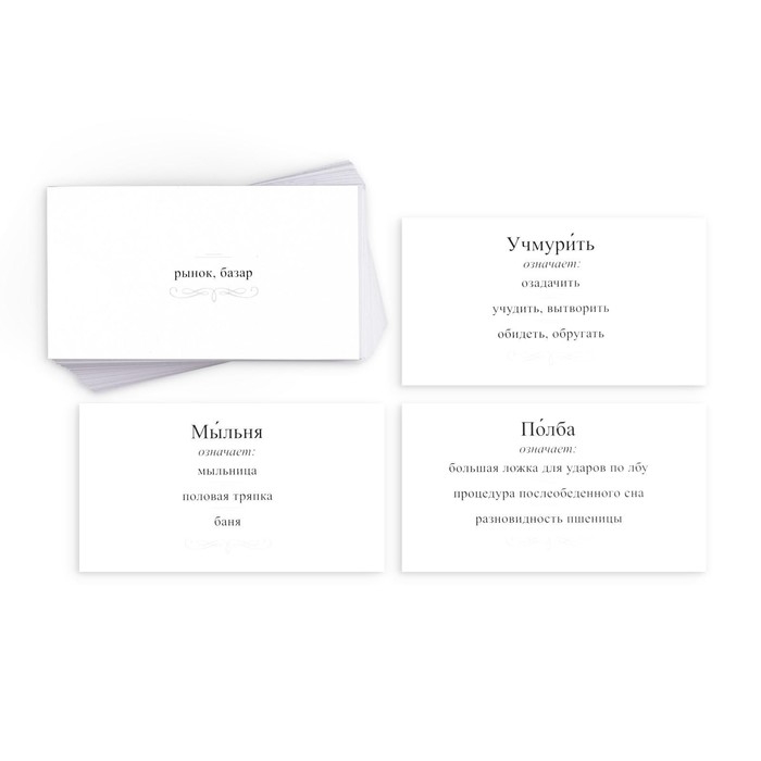 На лицевой стороне карточки написано слово, которое нечасто встретишь в современной русской речи, и три варианта его толкования. Правильный вариант только один. Задача игрока – определить его. Чтобы проверить себя или другого участника, просто переверните карту. Там находится ответ.