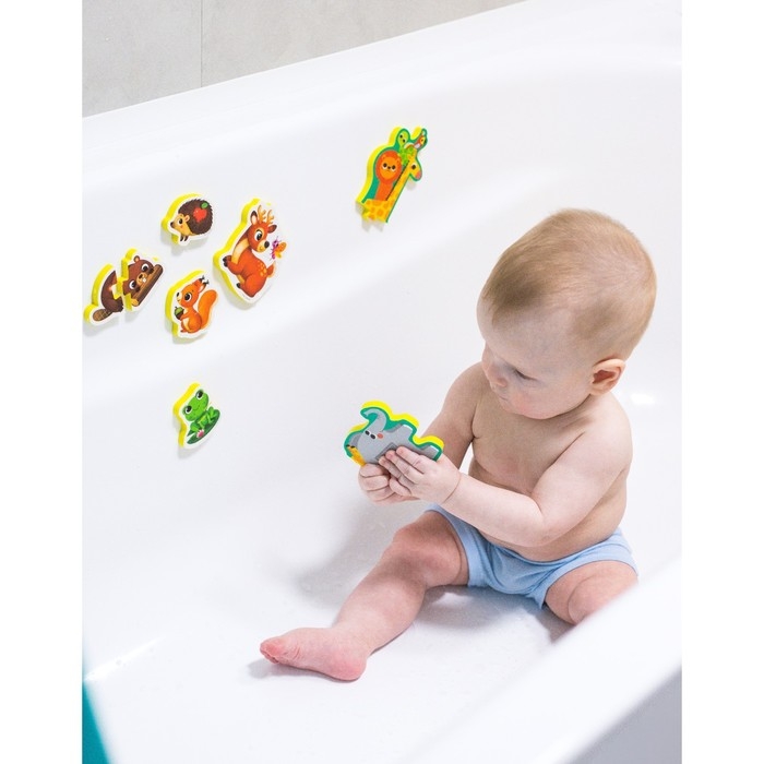 Забавные игрушки из мягкого материала не тонут в воде и при намокании приклеиваются к кафелю или ванне.