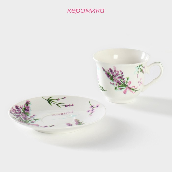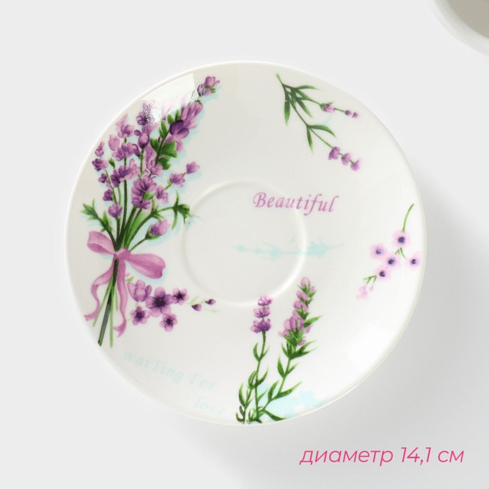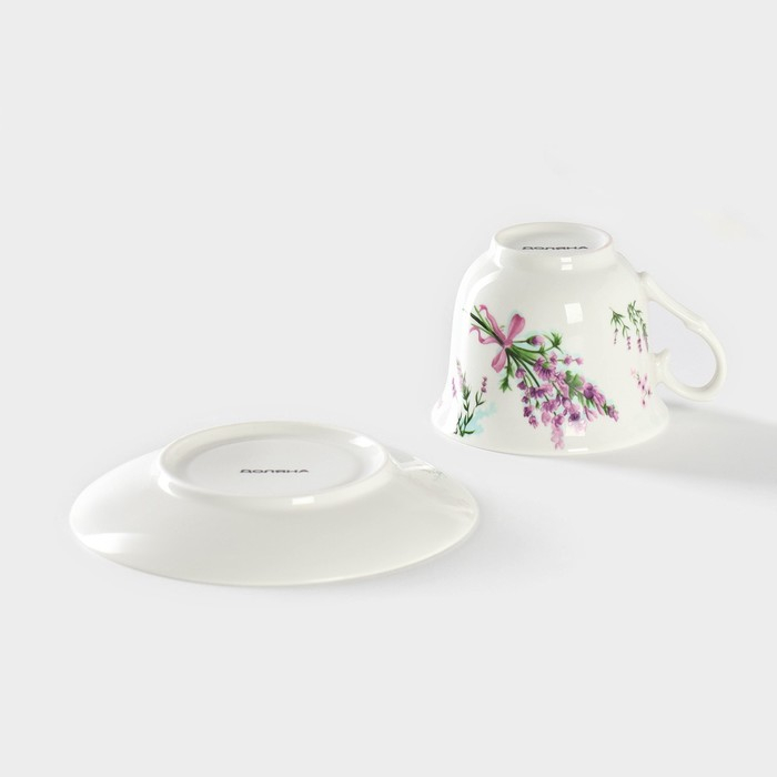 Чайная пара фарфоровая Доляна «Лаванда», 2 предмета: чашка 220 мл, блюдце d=14,1 см, цвет белый