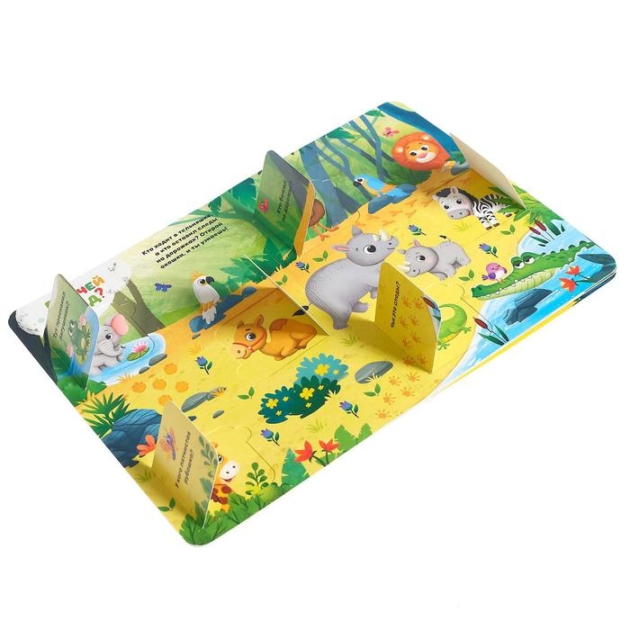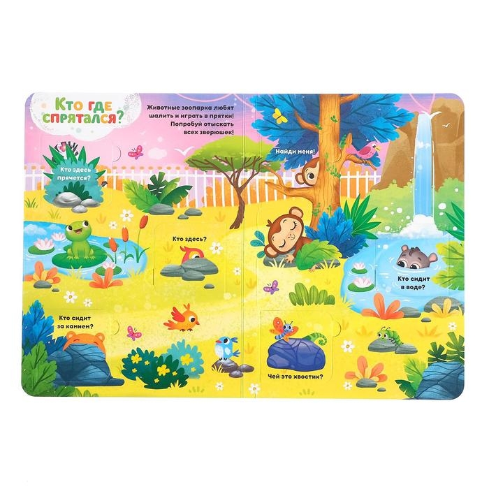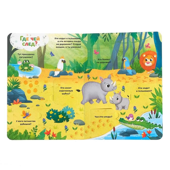 На страницах книги малыш встретит животных, которых можно увидеть в зоопарке, а ещё — много интересных вопросов о них. Чтобы узнать ответ, достаточно посмотреть, кто спрятался в окошке.