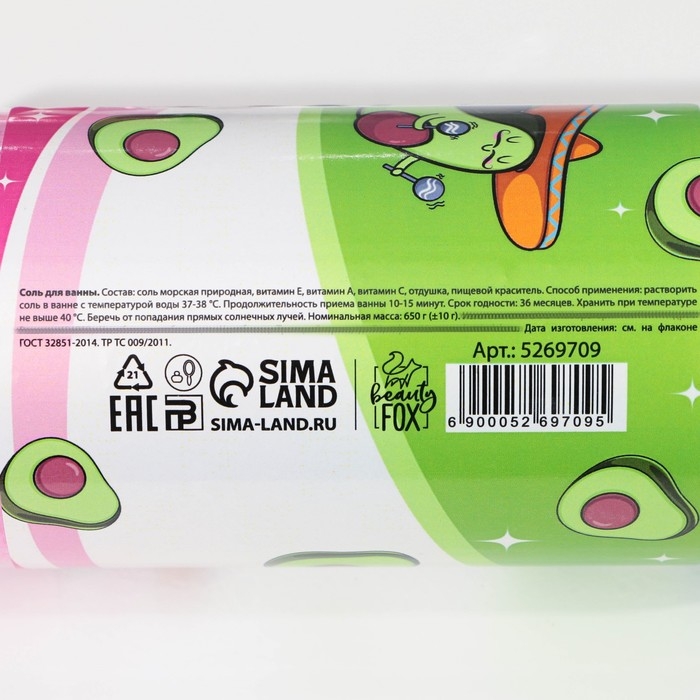 Состав: соль морская природная, витамин Е, витамин А, витамин С, отдушка, пищевой краситель.