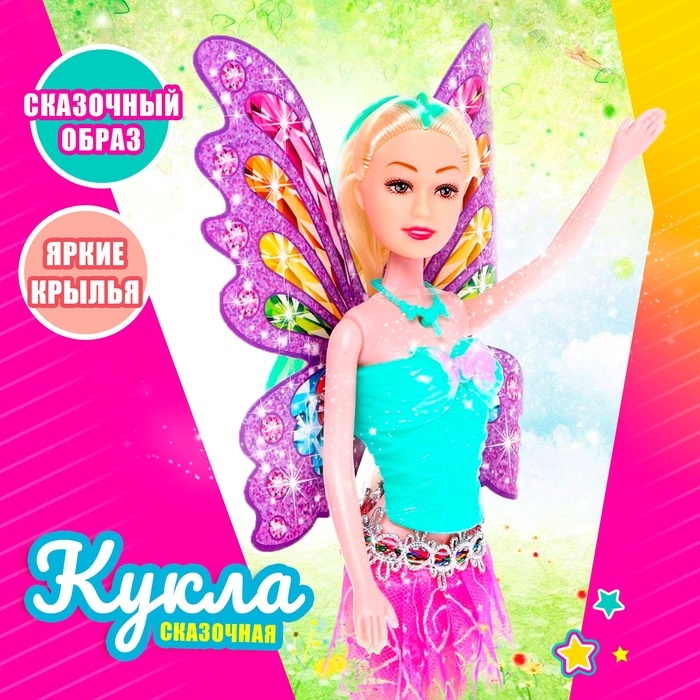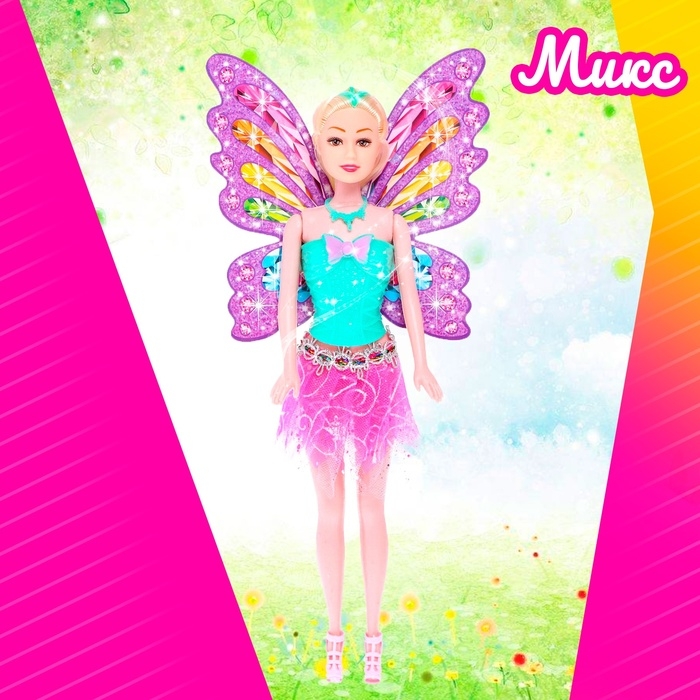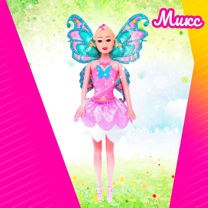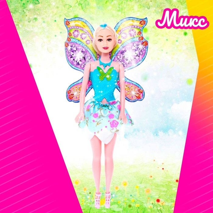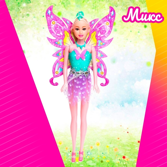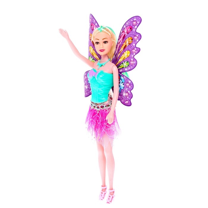 У куколки длинные волосы с цветными прядками. Расчешите их и сделайте красивую укладку. Нежное платье куклы-бабочки, туфельки и крылышки создают сказочный образ. Придумайте свой наряд для куколки.