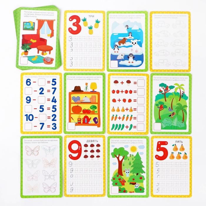 С помощью этих карточек ребёнок повторит счёт от 0 до 9, научится правильно писать цифры, а также потренируется в решении примеров на сложение и вычитание в пределах 10.